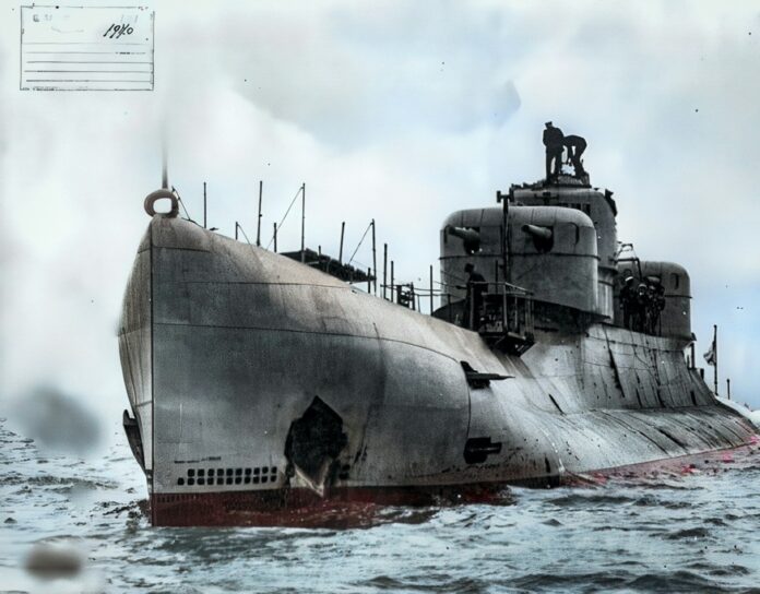 ILiveLeak presents a film of her in actionWith a displacement of 2.780 long tons/2.820 tons (surfaced)-3.600 long tons/3.700 (submerged) tons were her dimensions 110,70 x 9,07 x 4,6 metres or 363’6” x 29’9”x 15’. Fitted out with 2-8 cylinder Admiralty Diesel engines supplying 2.200 kW, 2-MAN Diesel engines supplying 890 kW and 2 GEC electric motors supplying totally 1.500 kW was her speed 9 (submerged)-19,5 (surfaced) resulting in a range of 12.400 nautical miles at 12 knots submerged pr 50 nautical miles with a speed of 4 knots while submerged. During tests she dived to depth of 110 metres or 360’. Her crew numbered 110 men. She was heavily armed, namely 2×7,7mm machine guns, 2×2-5.2” guns and 6-21” torpedo tubes. Due to lacking enough space in the narrow torpedo room it lasted 24 minutes to reload all torpedo tubes. The gun turrets were not protected by armour and placed before and after the conning tower.
